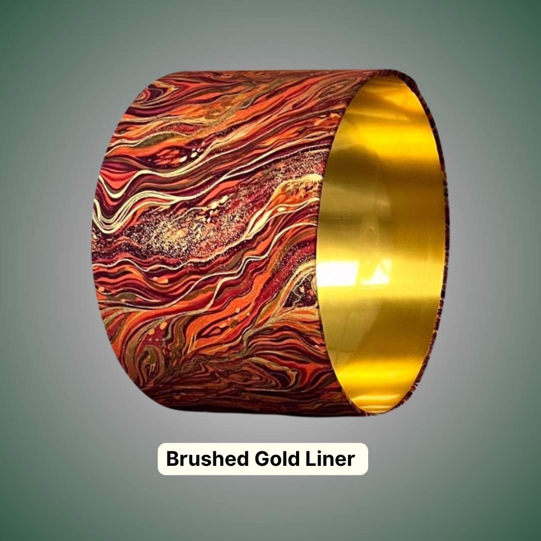 Add a bold splash of colour with this drum lampshade, featuring the luxurious "Palazzo" liquid marble design. The swirling waves of burnt orange, rich crimson, and molten gold are reminiscent of flowing lava, casting a rich ambient glow when illuminated.